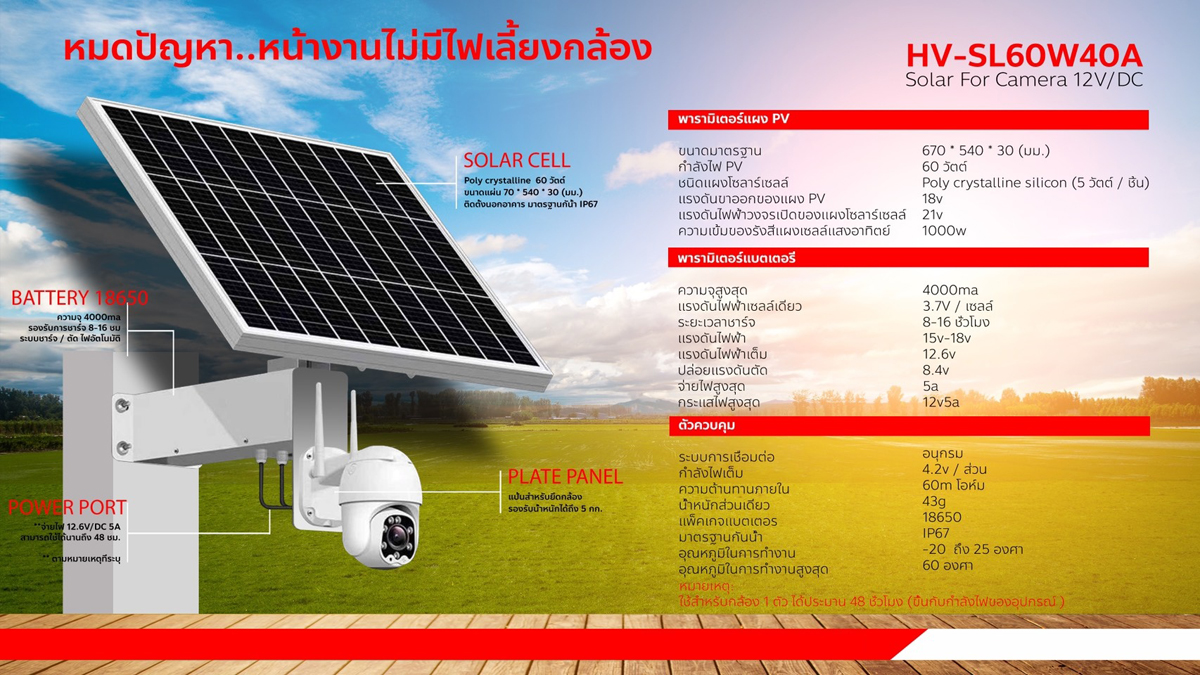 Poly crystalline silicon (5 วัตต์ / ชิ้น), ขนาดแผ่น 70*540*30 (มม.), ความจุ 4000 ma, รองรับการชาร์ท 8-16 ชม., ระบบชาร์ท / ตัด ไฟอัตโนมัติ, รองรับน้ำหนักได้ถึง 5 กก., ติดตั้งนอกอาคาร มาตรฐานกันน้ำ IP67